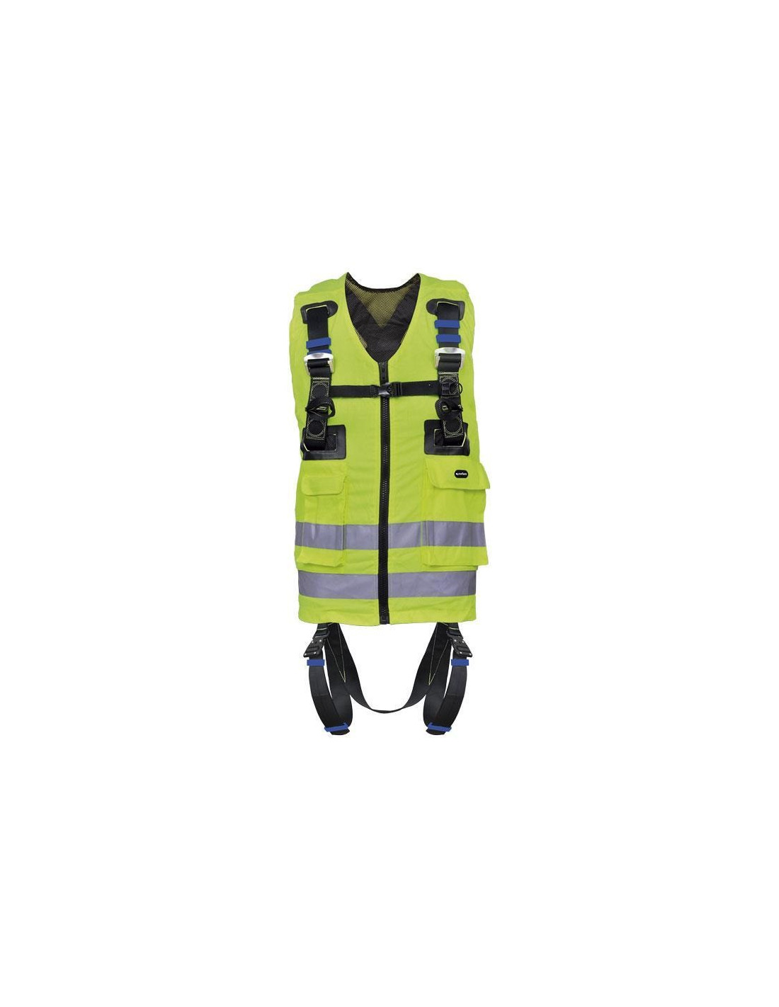 Arnés anticaídas con chaleco de trabajo de alta visibilidad amarillo incluido. Cuenta con dos puntos de enganche en el pecho, un punto de enganche esternal formado por dos hebillas textiles, una argolla en D dorsal para sistema anticaídas y dos bucles automáticos. El chaleco incluye dos bolsillos laterales. Aguanta un peso máximo de 140 kg. El arnés es talla única.