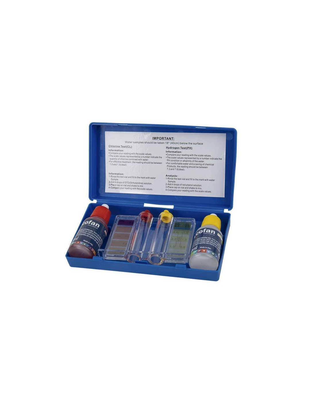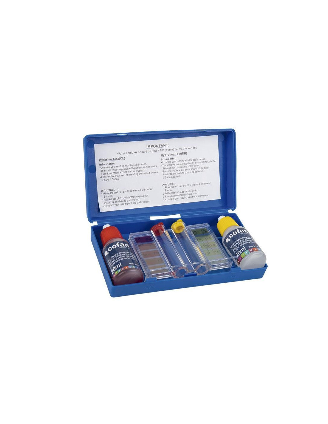 El kit medidor, que incluye un test de cloro y pH, es la herramienta ideal para mantener los niveles óptimos de cloro y pH del agua de la piscina, de manera sencilla y eficaz. Diseñado para ofrecer lecturas precisas y rápidas del nivel de cloro y pH en el agua de la piscina. El kit incluye dos reactivos líquidos, Phenol Red para el pH y OTO para el cloro/bromo, garantizando resultados confiables en minutos. Con este kit, medir los niveles de cloro y pH es un proceso sencillo y directo. Basta con llenar el compartimento con agua de la piscina, añadir las gotas del reactivo correspondiente, agitar y comparar el color resultante con la escala de valores incluida. Es una manera eficiente de asegurar que el agua de la piscina está en las condiciones adecuadas. Apto para todas las piscinas, independientemente de su tamaño o tipo. Ya sea para una piscina de agua dulce, salada, grande o pequeña, este kit es ideal. Cada kit viene con dos reactivos líquidos de 20 ml: Phenol Red para medir el pH y OTO para medir el cloro/bromo. Estos reactivos están formulados para ofrecer una alta precisión y durabilidad, asegurando la confianza en cada prueba que se realice. El kit incluye una escala de colores fácil de leer que permite interpretar rápidamente los resultados de la prueba. Esto ayuda a ajustar los niveles de productos químicos en la piscina de manera oportuna para mantener un entorno seguro. Consejos: Realiza pruebas periódicas para asegurar que el agua de la piscina esté equilibrada y segura para nadar. Detecta rápidamente cualquier desequilibrio en los niveles de cloro y pH para tomar medidas correctivas inmediatas. Mantén la calidad del agua en óptimas condiciones, evitando la proliferación de algas y bacterias que pueden afectar la salud de los nadadores. Con la capacidad de monitorear y ajustar los niveles de cloro y pH de manera precisa, puede disfrutar de la piscina con la tranquilidad de saber que estás proporcionando un entorno seguro y saludable. Modo de empleo. Medir el Cloro: Llena el tubo con agua de la piscina hasta la marca indicada. Añade 4 gotas del líquido OTO, tapa el tubo y agítalo. Compara el color resultante con la escala de valores para determinar el nivel de cloro. Medir el pH: Llena el tubo con agua de la piscina hasta la marca indicada. Añade 4 gotas del líquido Phenol Red, tapa el tubo y agítalo. Compara el color resultante con la escala de valores para conocer el nivel de pH.
