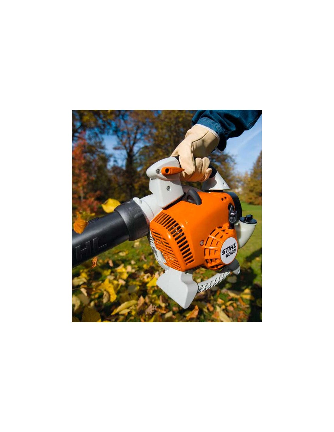 Cómodo soplador con un potente caudal de aire para limpiar hojas caídas, restos de poda o siega en superficies grandes. Con arranque fácil STIHL ErgoStart (E) y cómodo sistema antivibración.